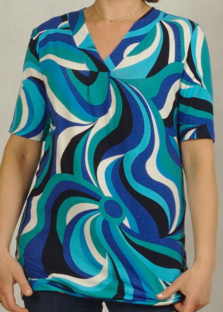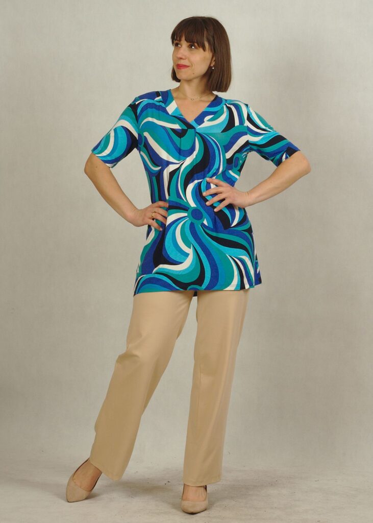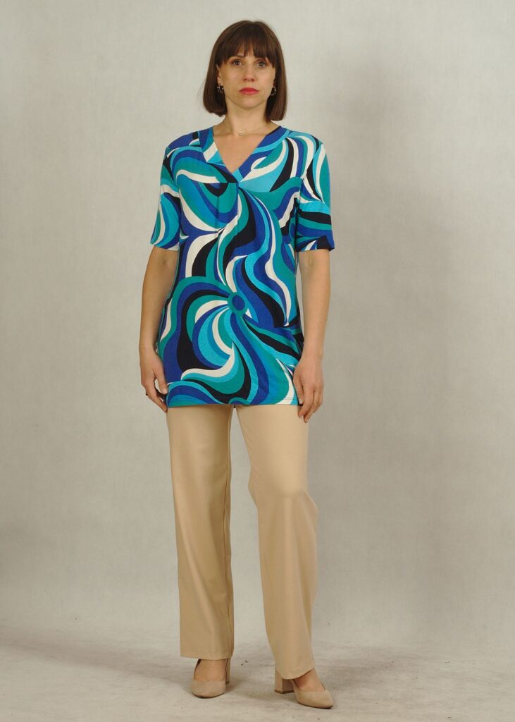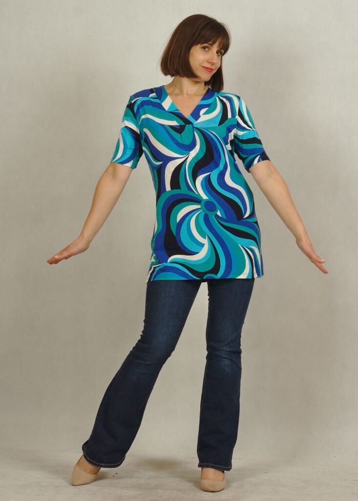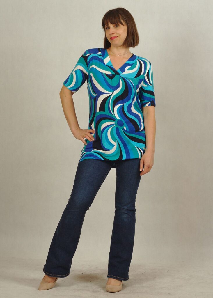 Tunika w serek z krótkim rękawem świetnie podkreśla dekolt i optycznie wysmukla sylwetkę.
