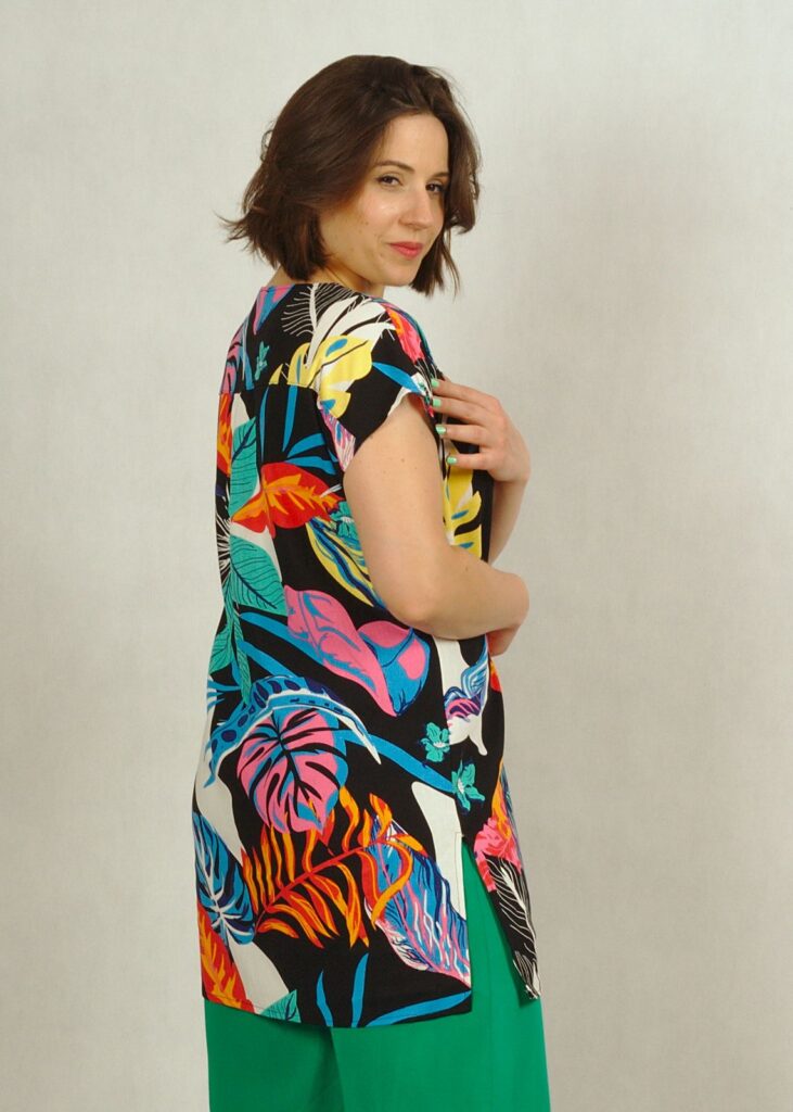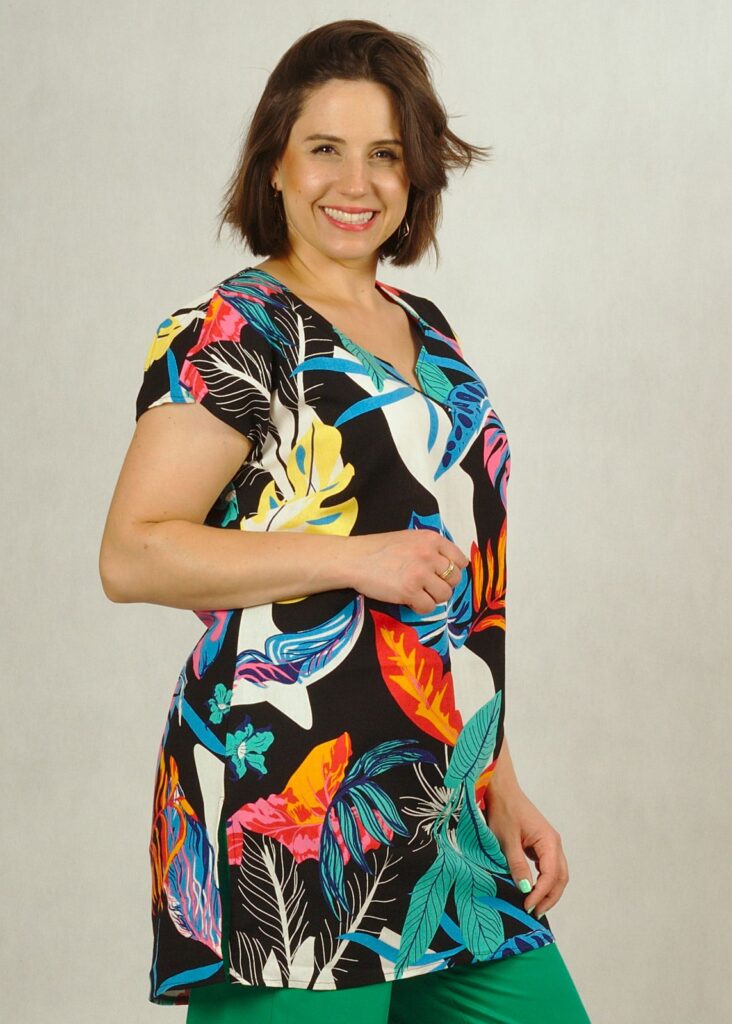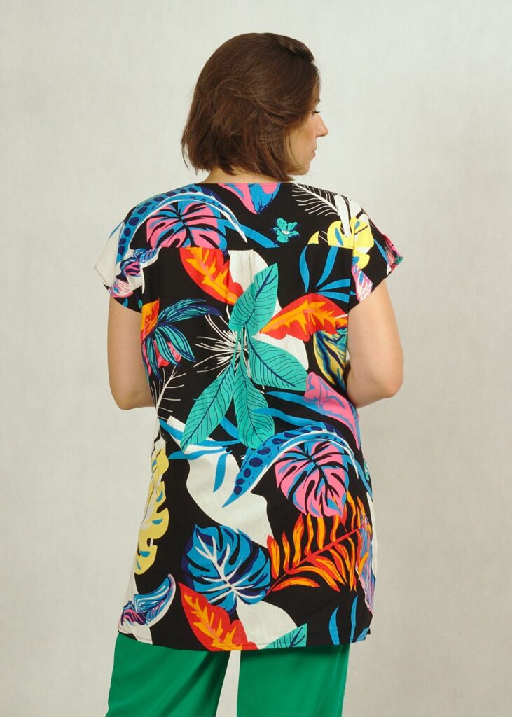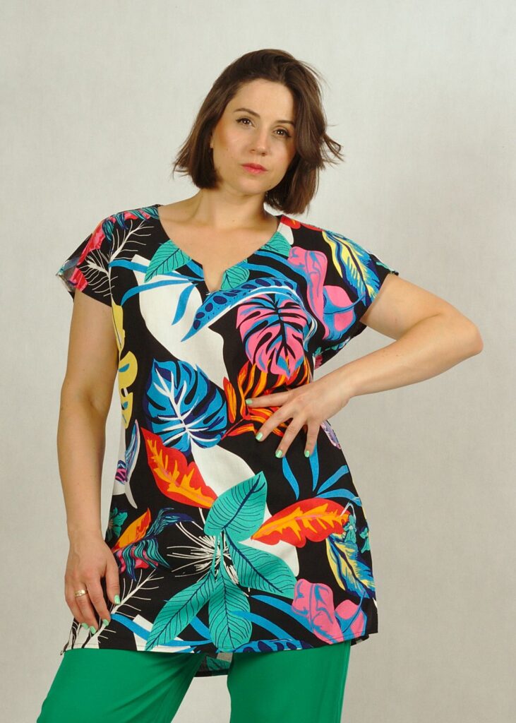 Tunika ma delikatnie trapezowy fason, dekolt w serek z ciekawym pęknięciem.