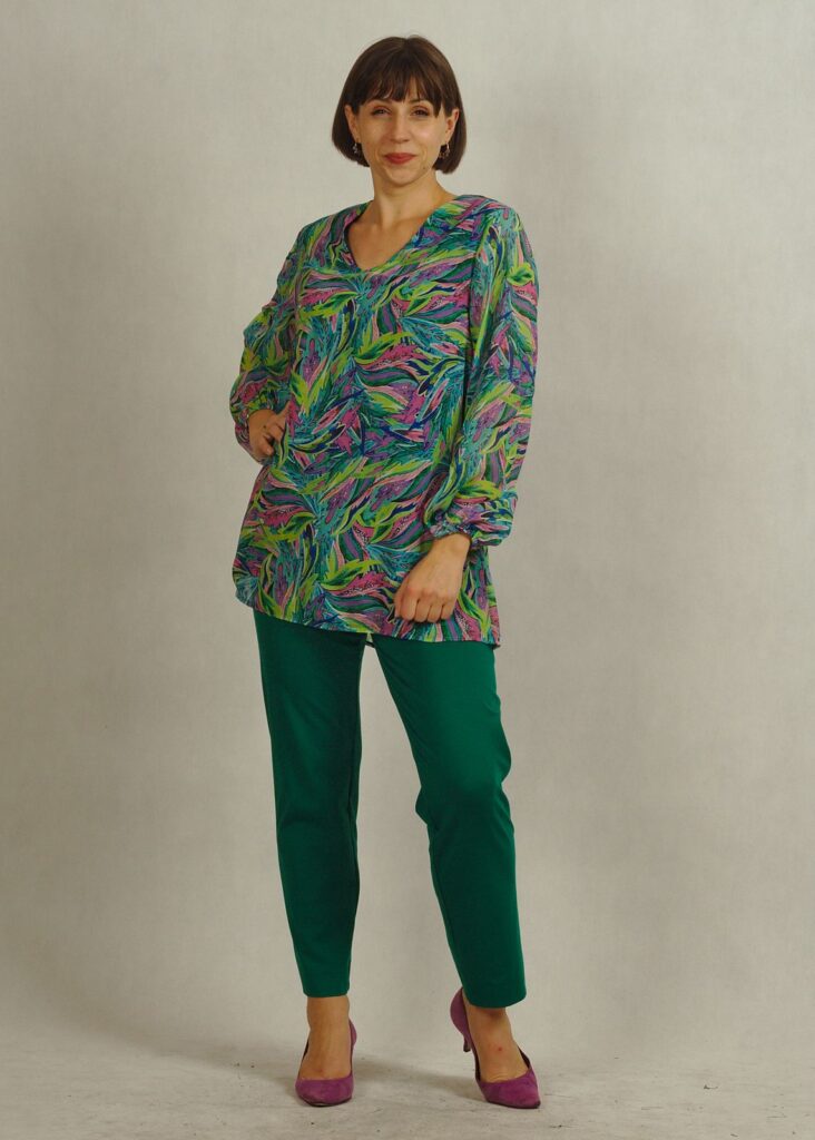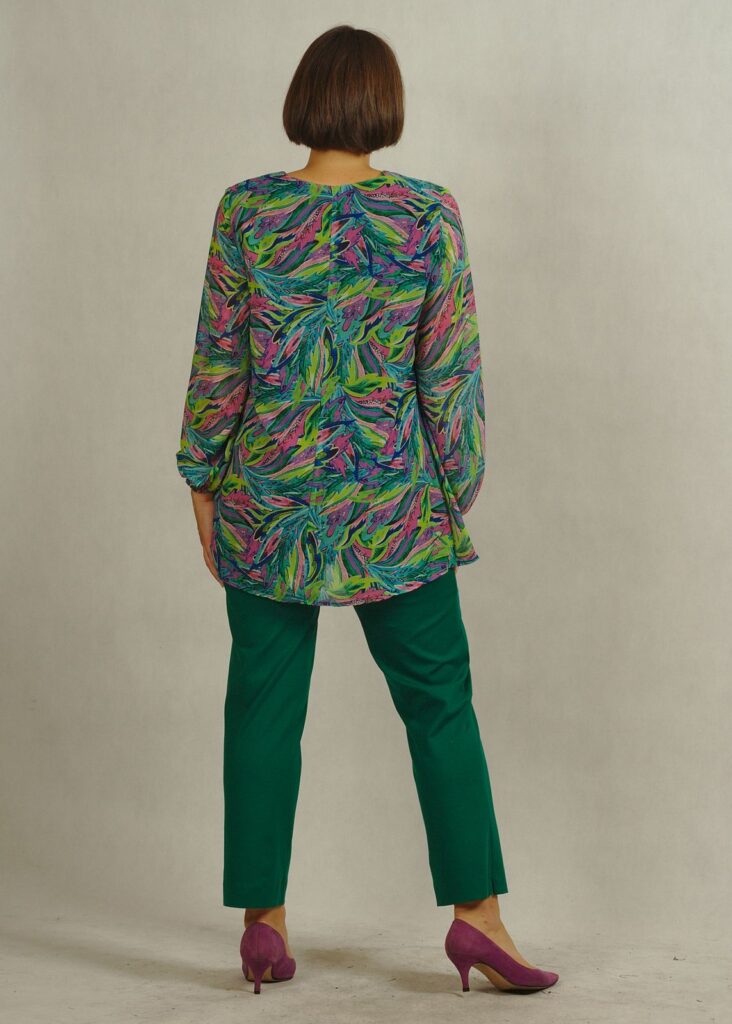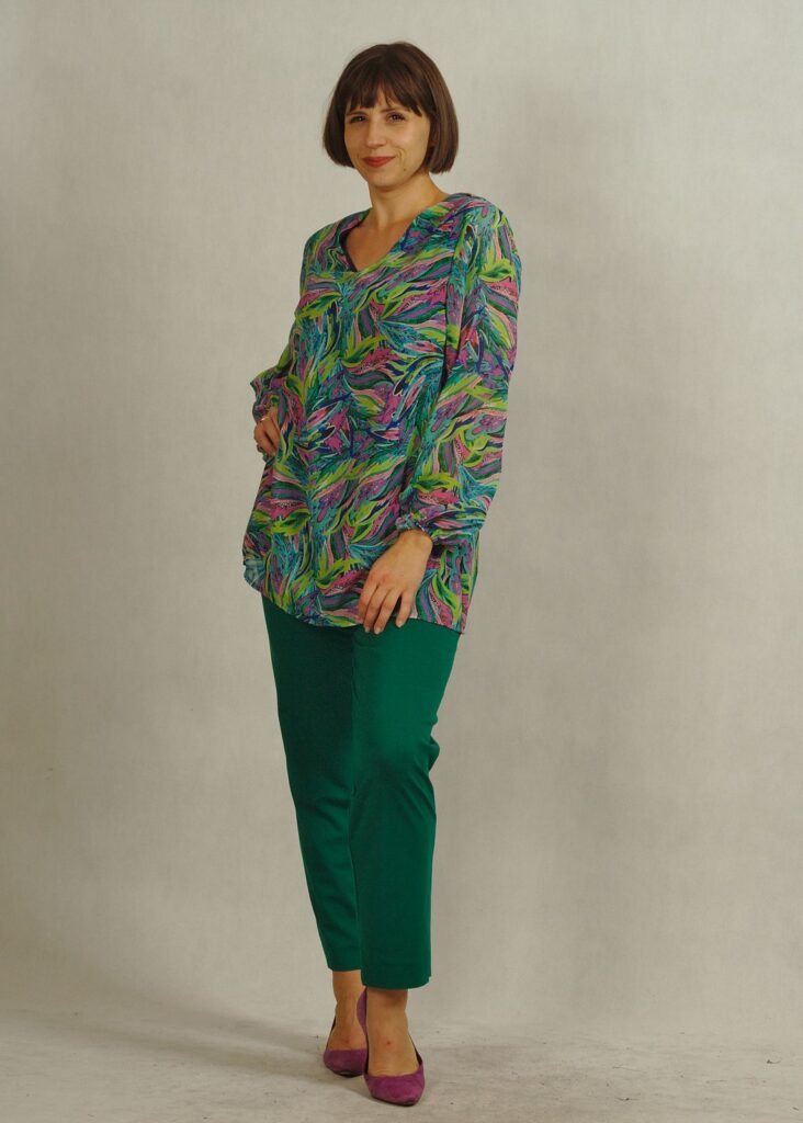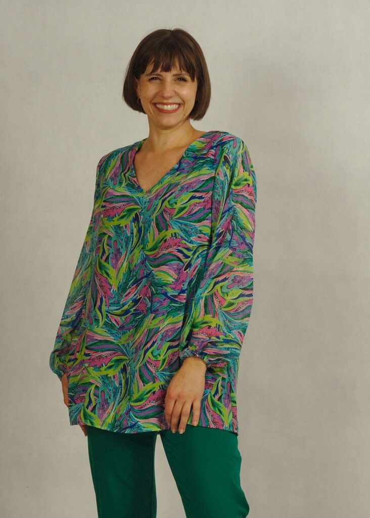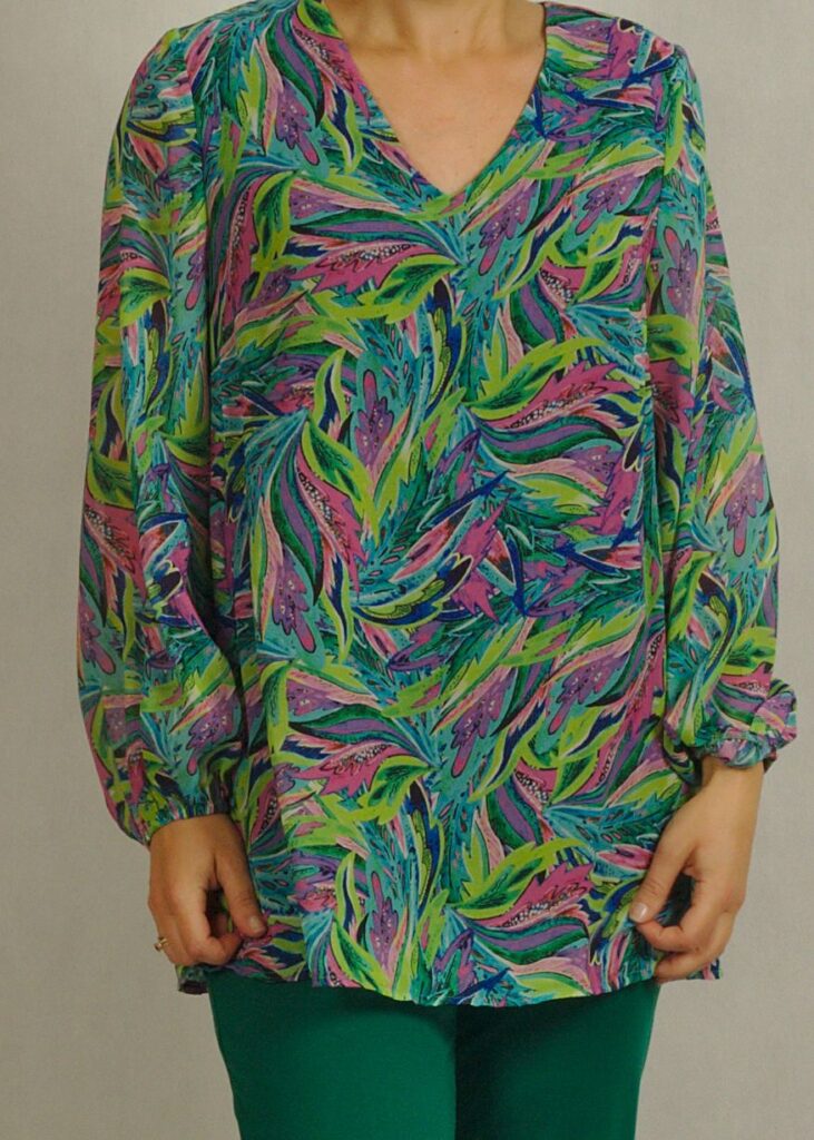 To elegancka tunika z dekoltem w serek, który subtelnie wysmukla szyję i dodaje kobiecego uroku.