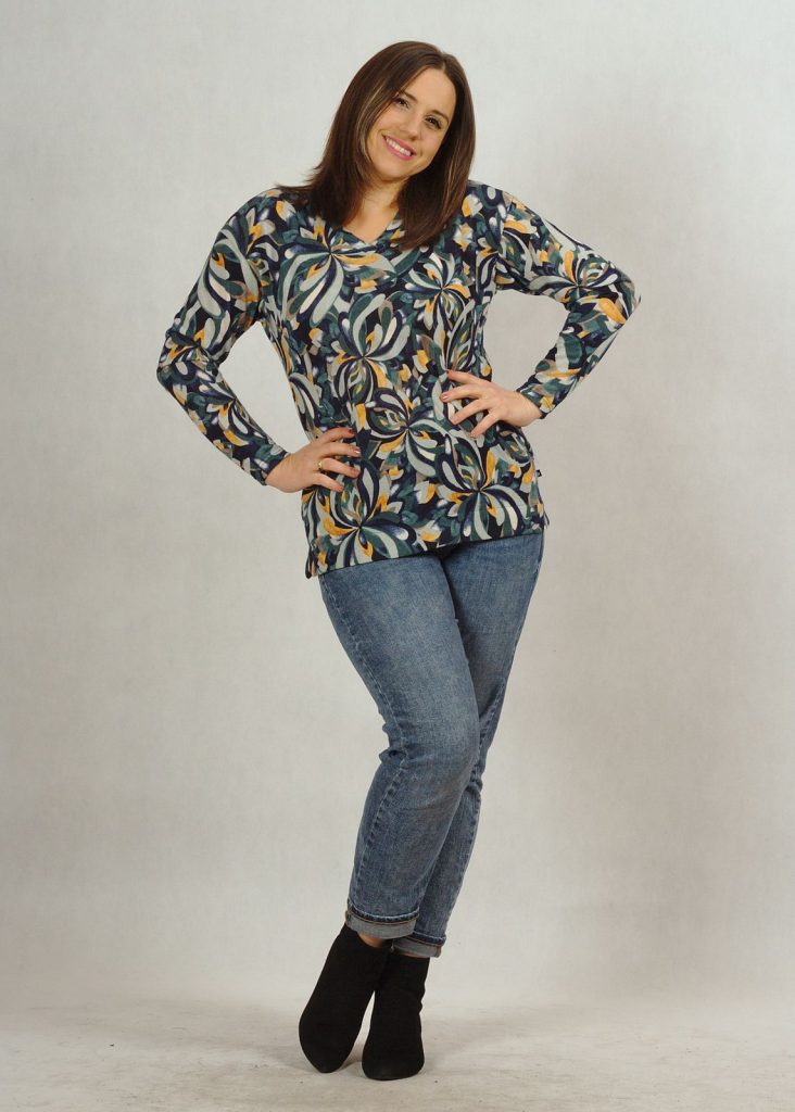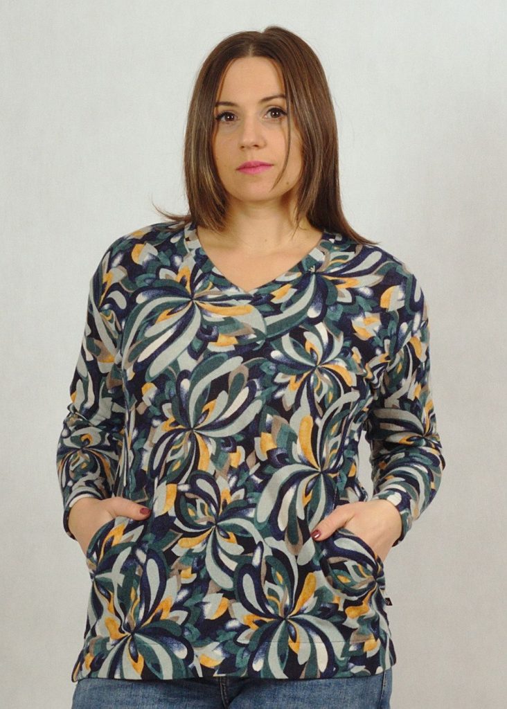 Sweterek ma kieszenie i i dekolt w serek, pięknie obszyty plisą z tego samego materiału.