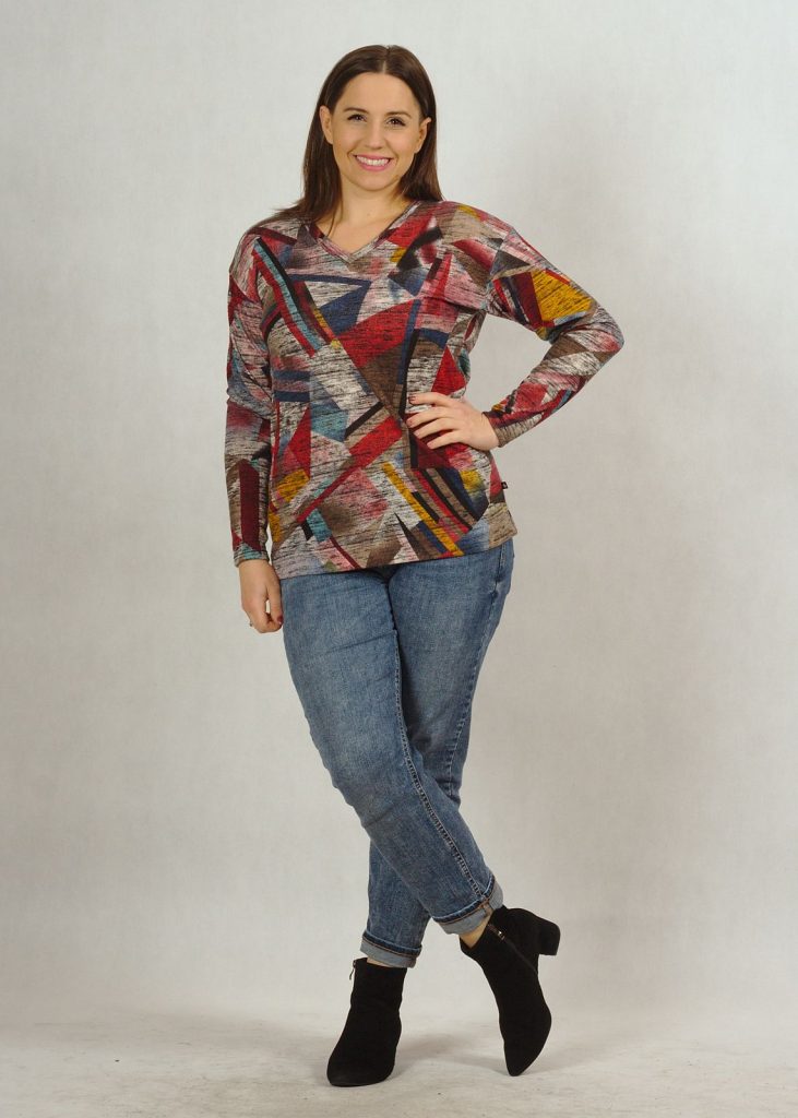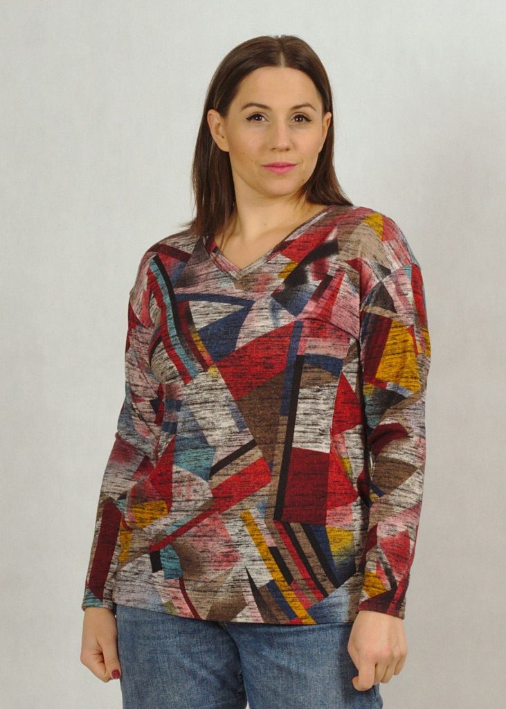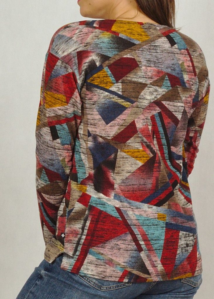 Geometryczny wzór na sweterku jest bardzo charakterystyczny.