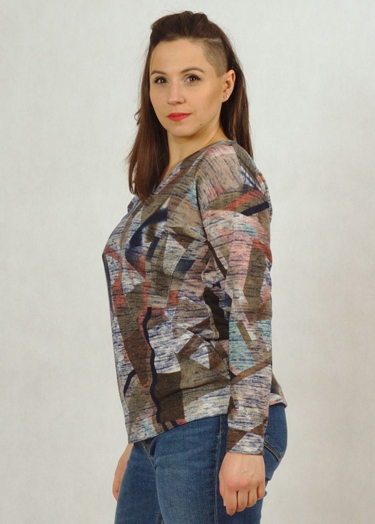 Sweterek ma kieszenie i i dekolt w serek, pięknie obszyty plisą z tego samego materiału.