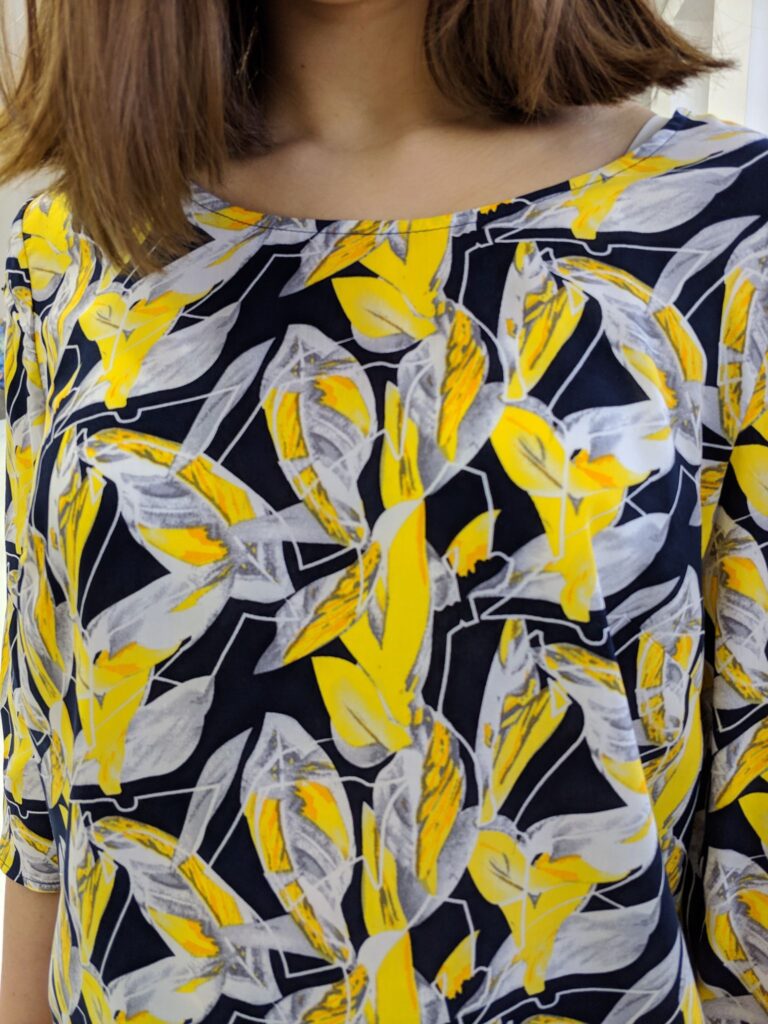 Bluzka ma półokrągły dekolt i rękaw 3/4.