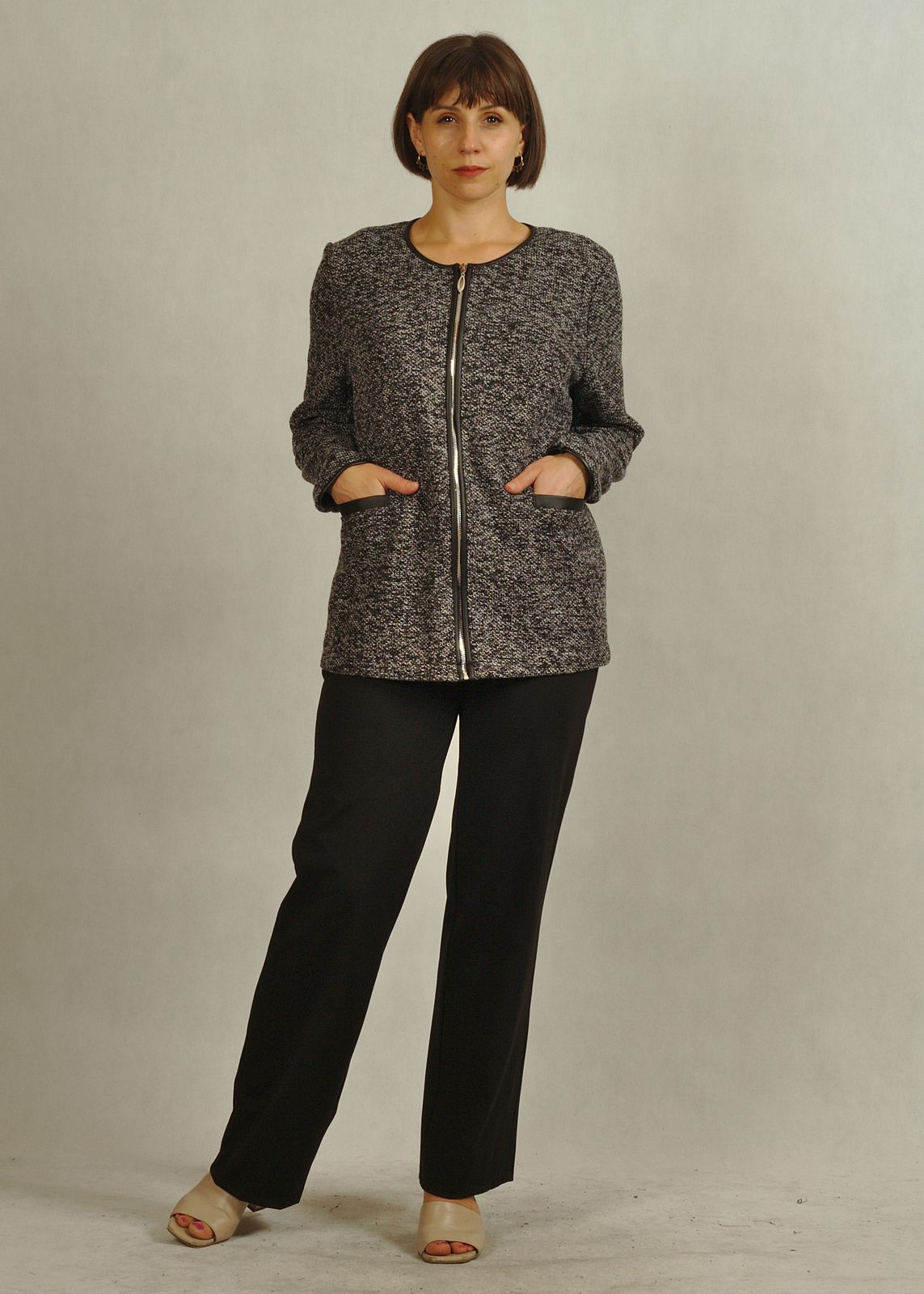 Żakiet dzianinowy, ozdobiony jest czarną lamówką z ekoskóry przy dekolcie, rękawach i idealnie wszytych kieszeniach.