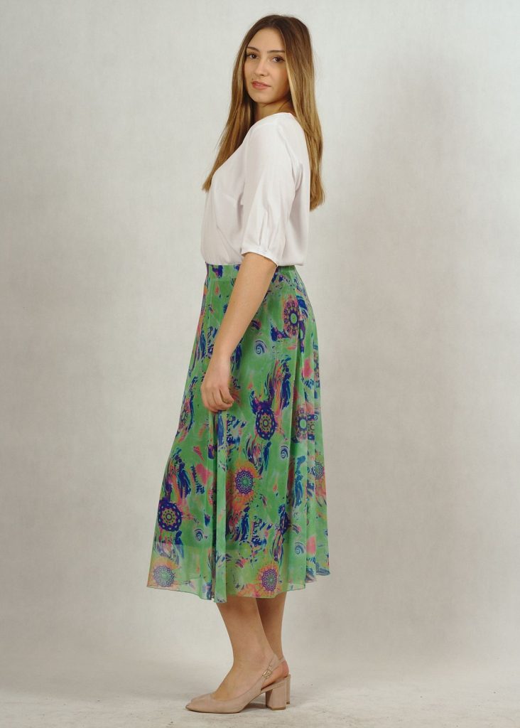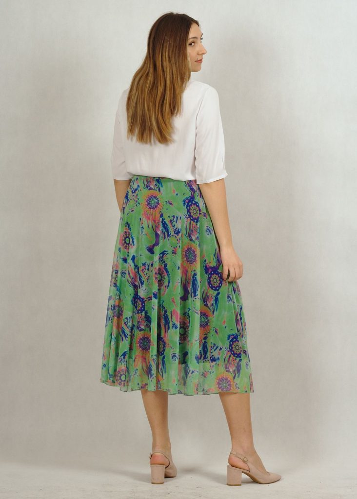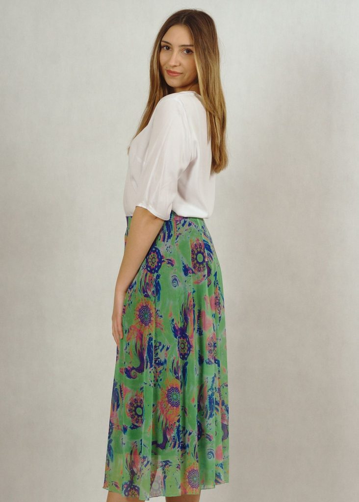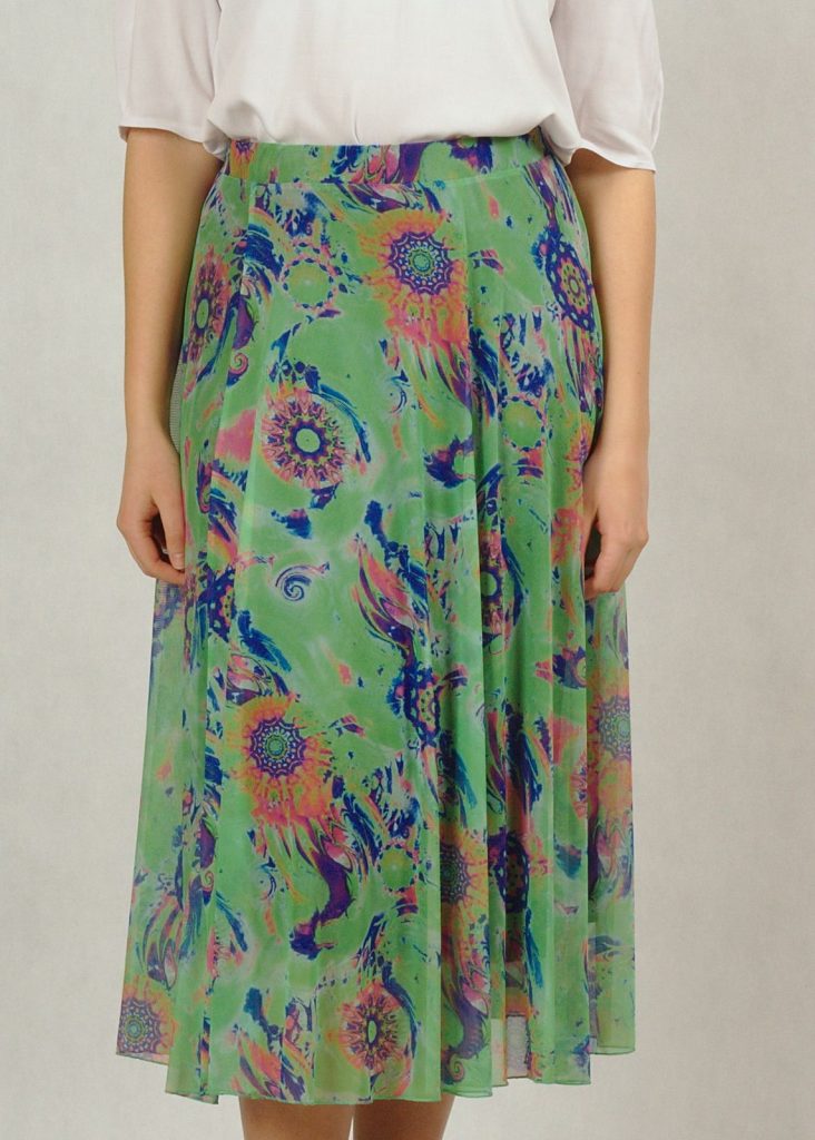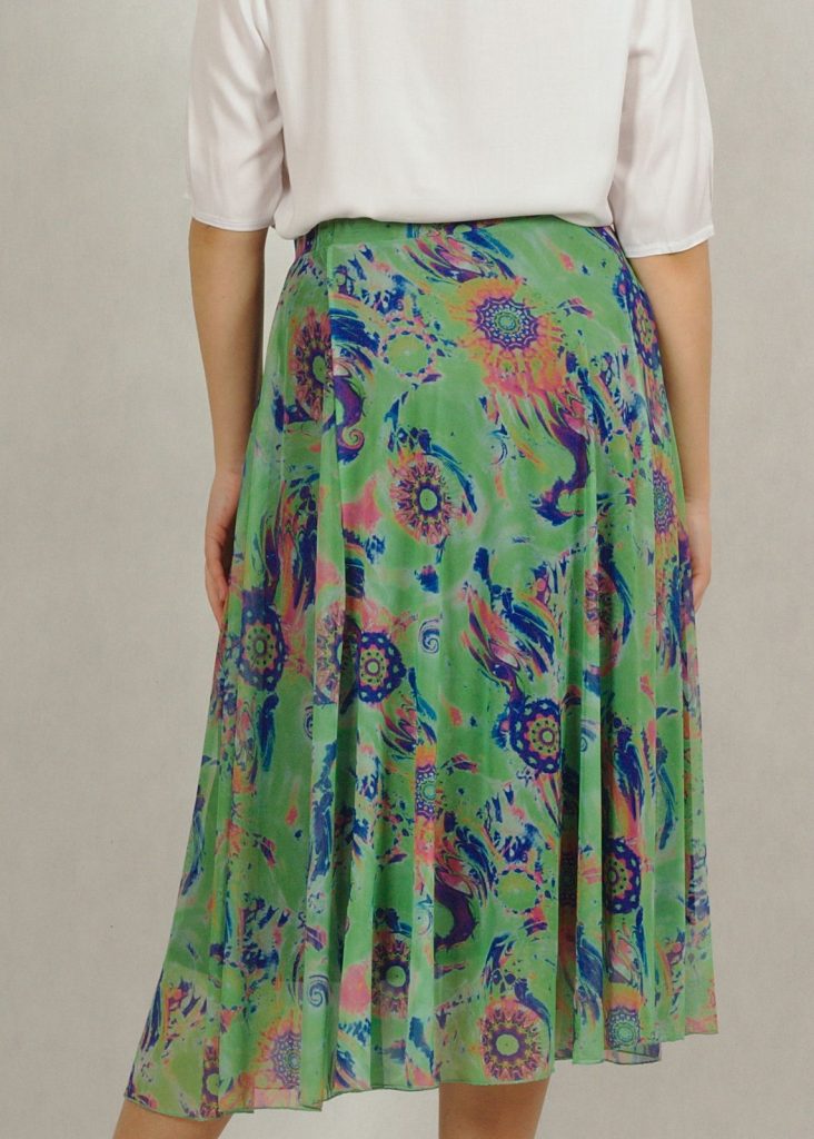 Długa spódnica składająca się z dwóch części – z wiskozowej podszewki z dzianiny oraz z poliestrowej siatki drukowanej.