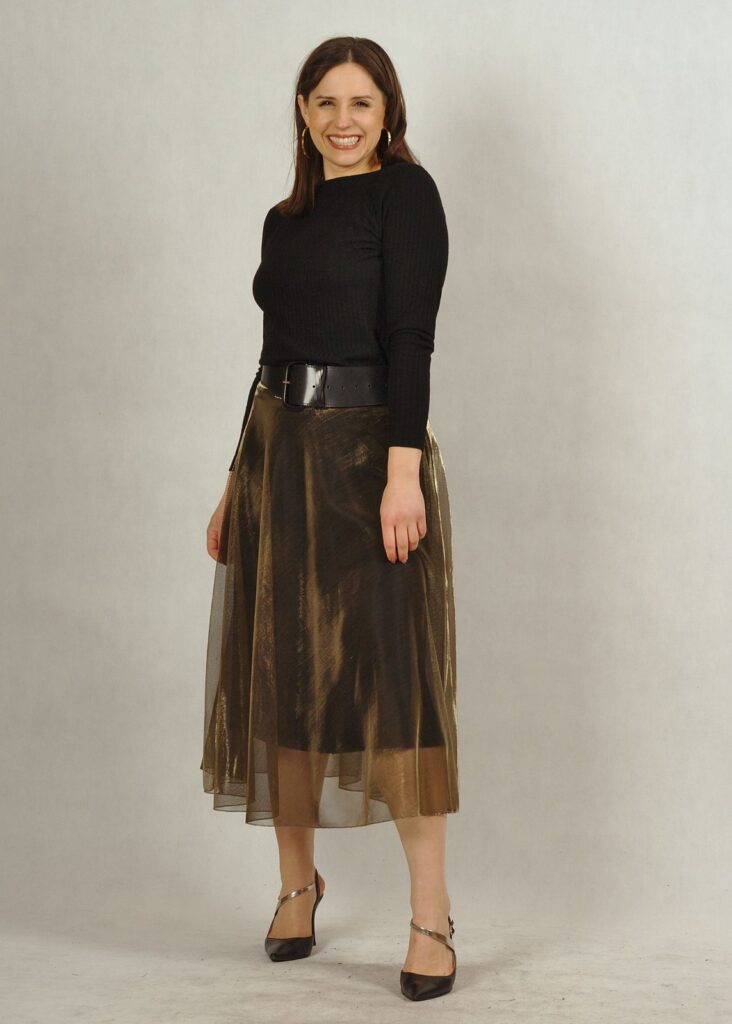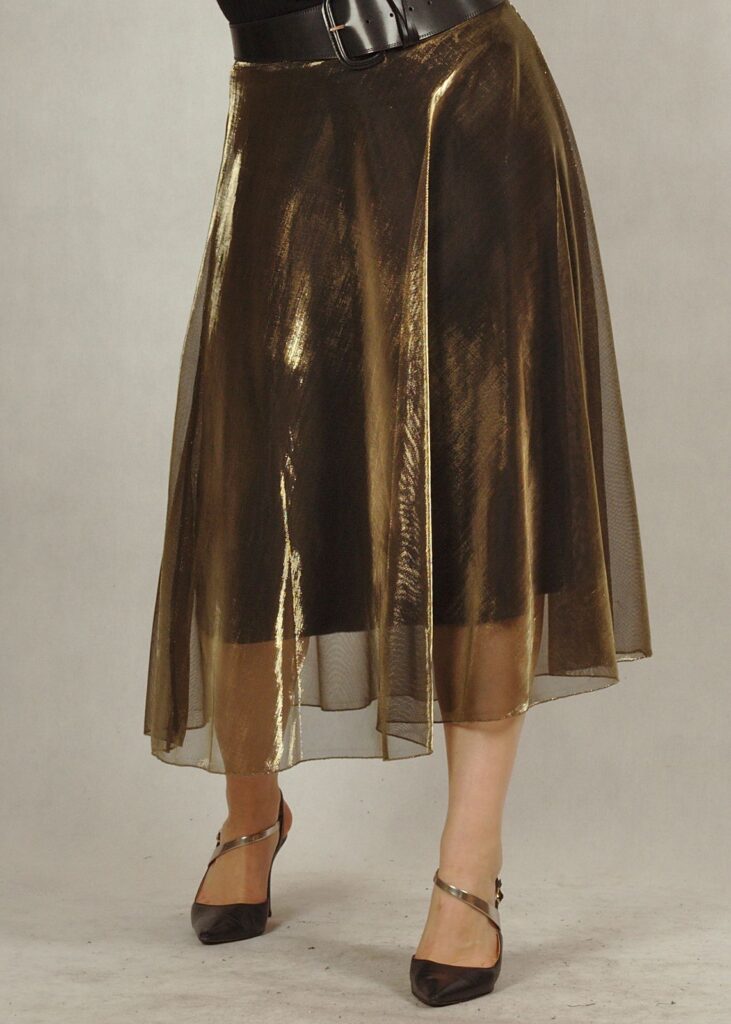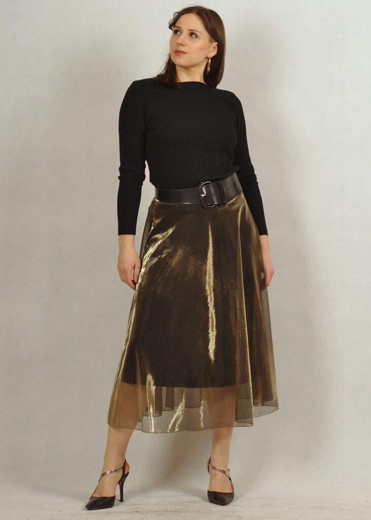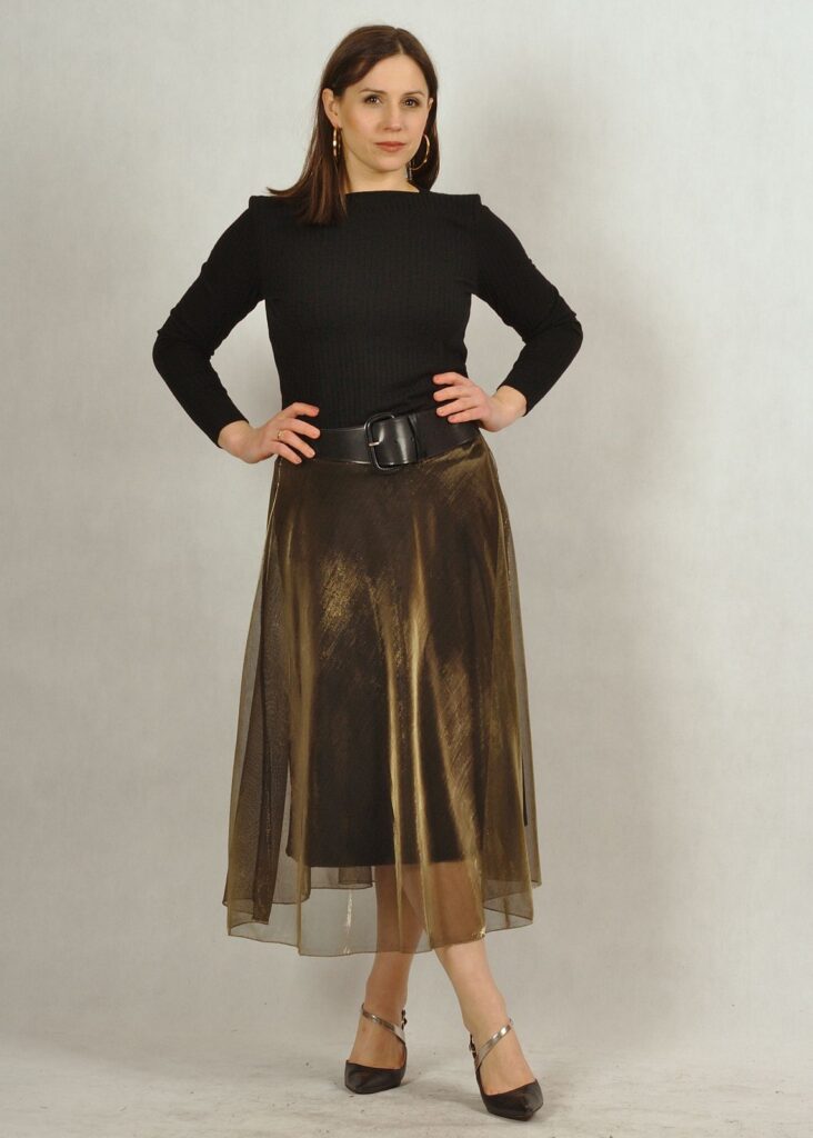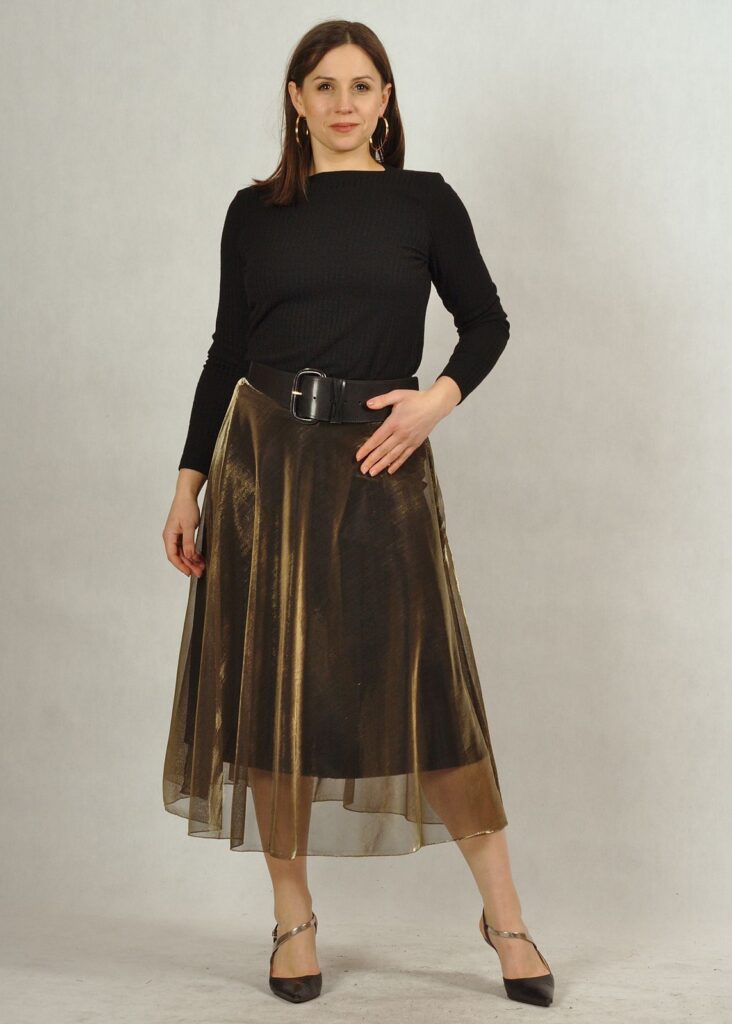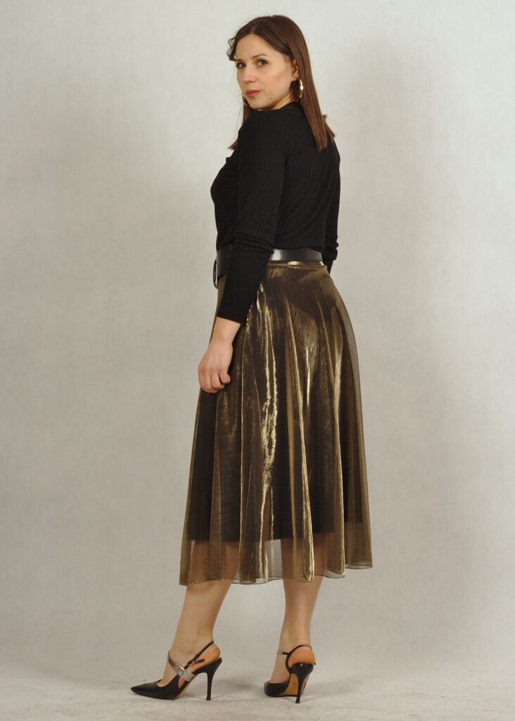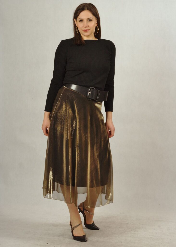 Długa spódnica składająca się z dwóch części – z wiskozowej podszewki z dzianiny oraz z poliestrowego materiału w kolorze złotym*.